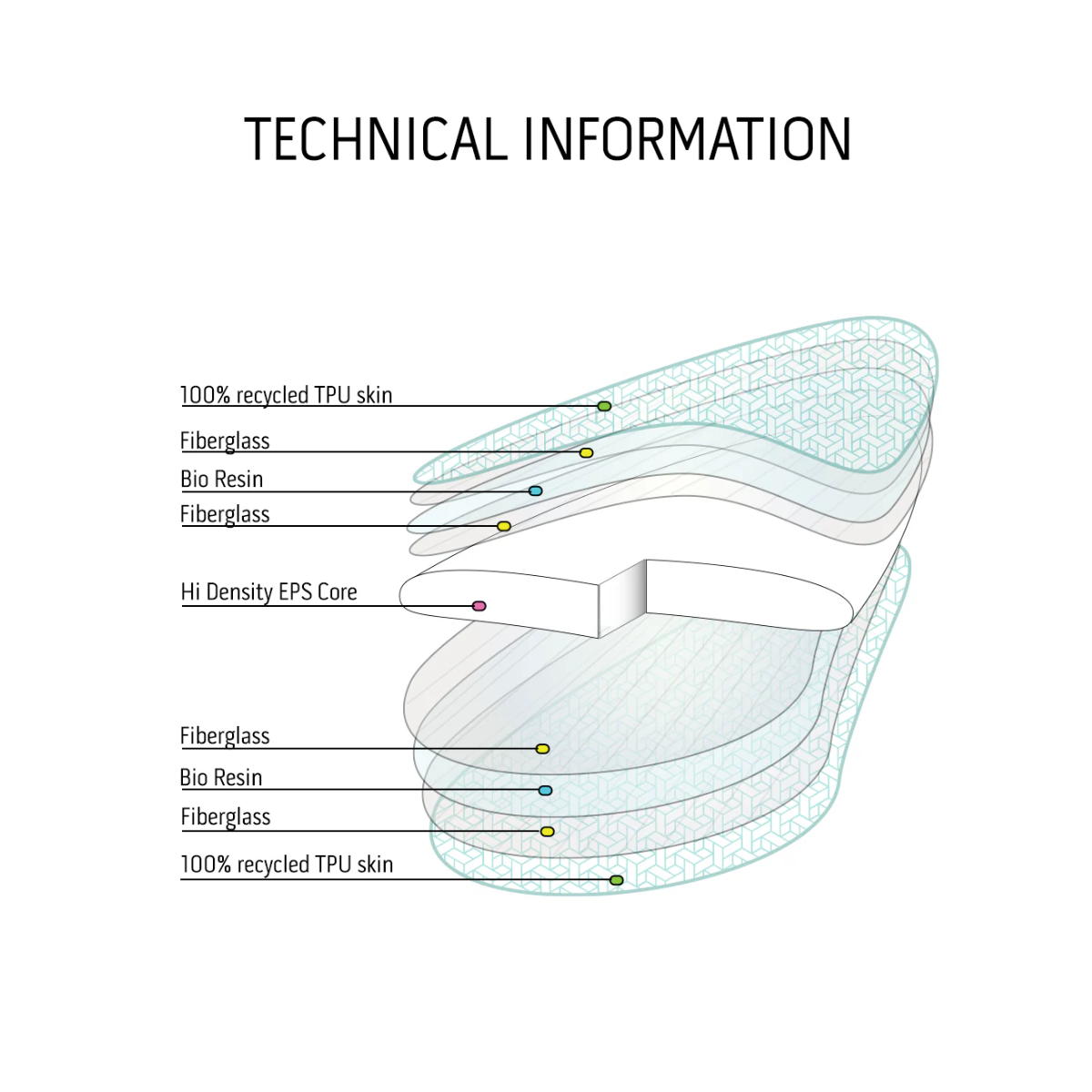 This board features a durable, flexible 100% recycled TPU outer shell, a shaped core wrapped in fibreglass and bio-epoxy resin.