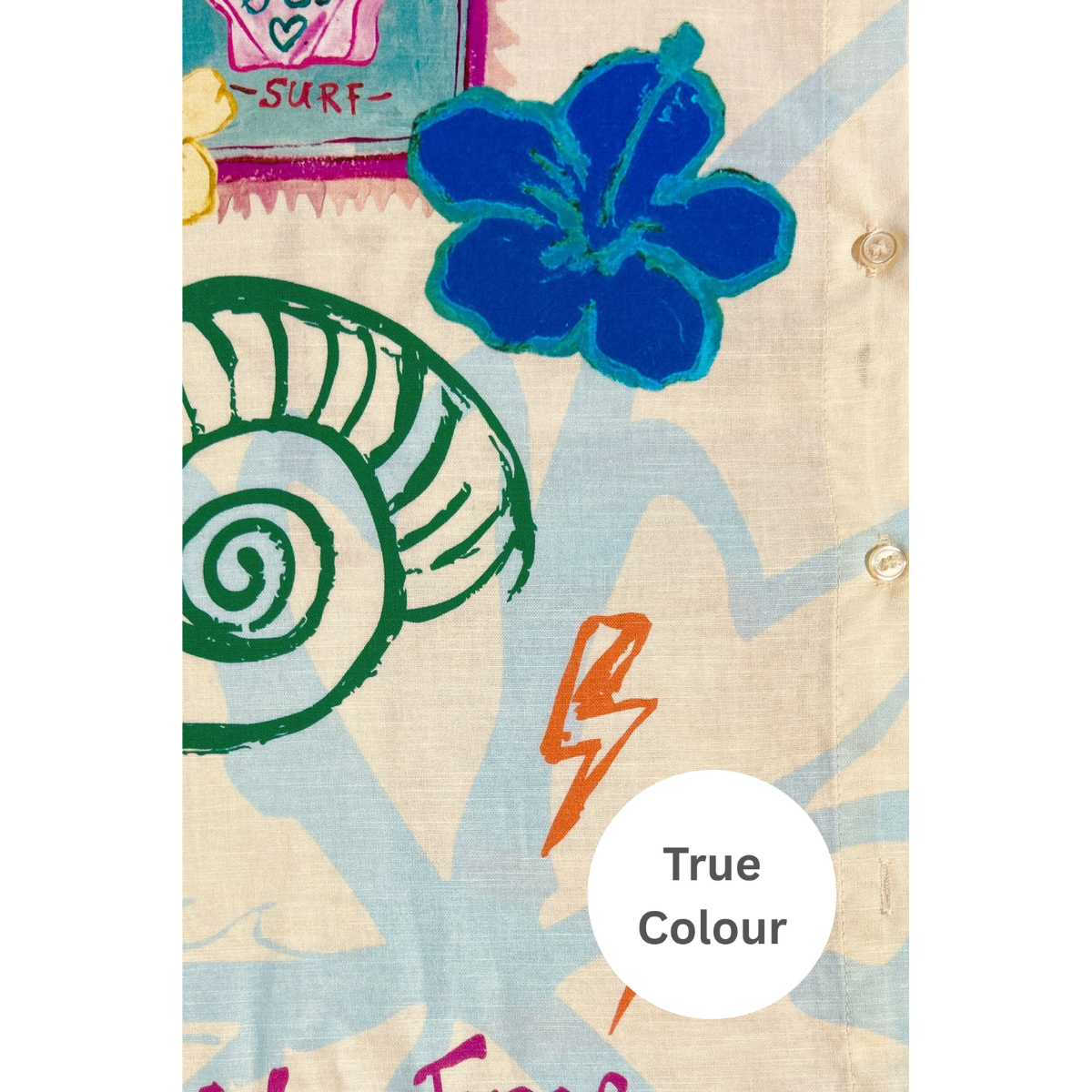 Featuring bold, hand-drawn Seas The Day artwork across the fabric, this long sleeve button-up brings together mermaids, shells, suns and scribbled details in true Sabbi style. Cut in an easy, loose fit and crafted from a lightweight, breathable fabric, its perfect worn open, softly buttoned or thrown on when the sun dips.