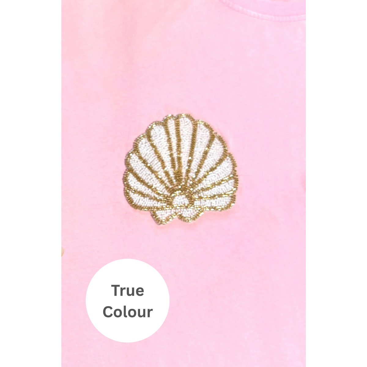 Cut in a very oversized, slouchy fit, this tee features sparkling shell embroidered artwork on the front and statement Broken Shells Still Glisten In The Sun wording across the back. Effortless, playful and designed to shimmer just like you do.